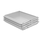 Półki tego modelu zostały wykonane z mocnego aluminium, a ramiona z metalu pomalowanego proszkowo na kolor srebrny. Spody półek wykonane są z trwałej, grubej, przezroczystej płyty pleksi.