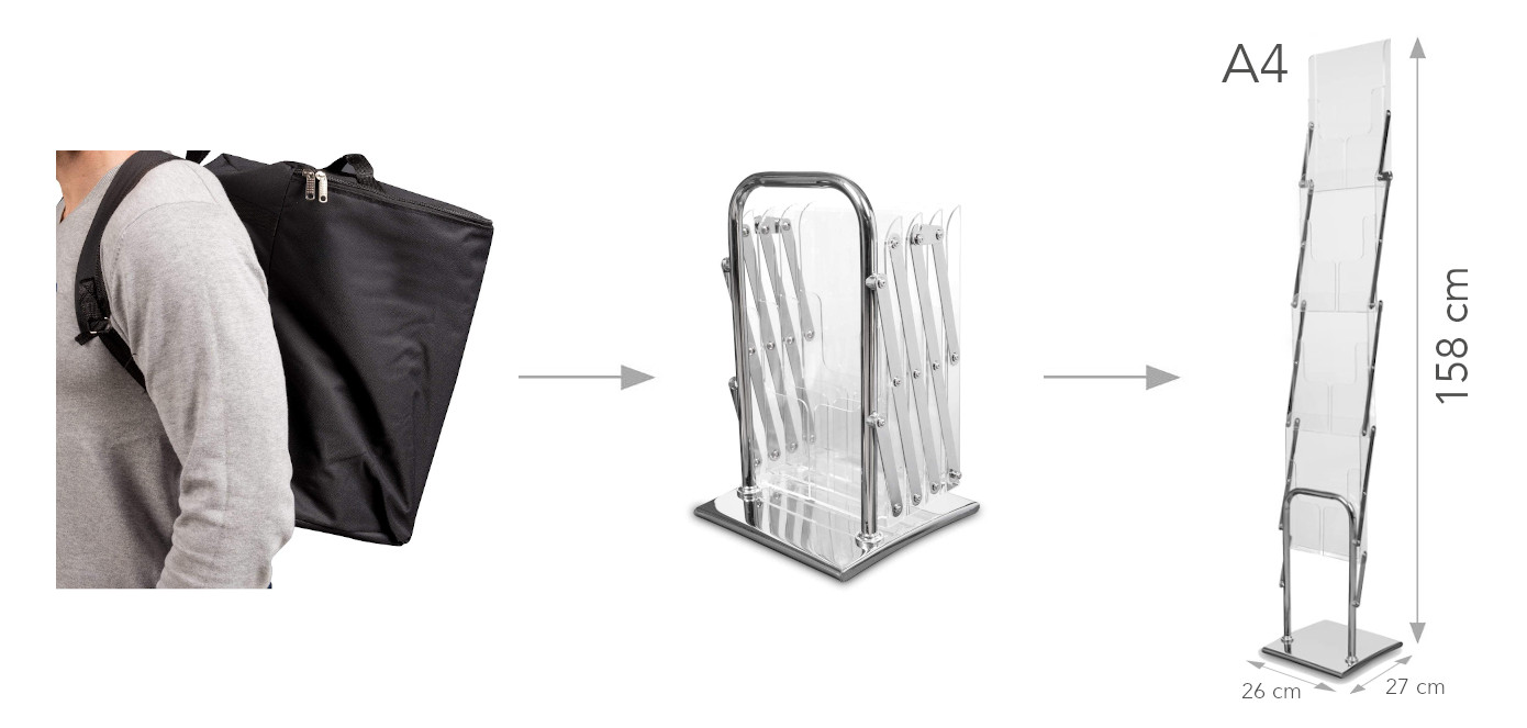 Columbia to wyjątkowo elegancki stojak, którego kieszenie wykonane zostały z grubej, przeźroczystej pleksi. Wyjątkowego charakteru nadaje mu chromowana podstawa i elegancki uchwyt ułatwiający przenoszenie stojaka. Ten produkt jest dodatkowo wyposażony w poręczny plecak do przenoszenia stojaka. Stojak przeznaczony jest dla ulotek/katalogów o formacie A4.